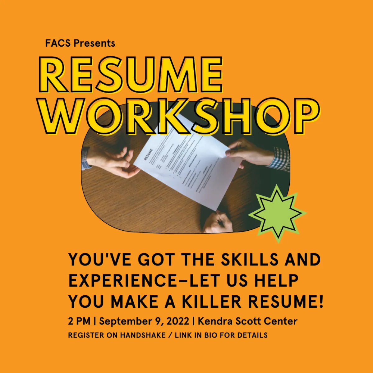 Students will learn about the different types of resumes and their various purposes in order to come away with the tools to format a basic resume. There will be opportunities to see examples of effective resumes from various disciplines in the arts. This is a great chance to get advice and feedback about your own resume, no matter what shape it is in!