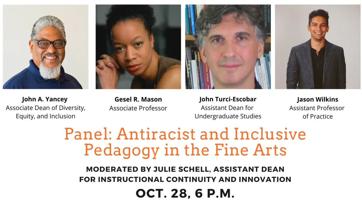 Julie Schell, Assistant Dean for Instructional Continuity and Innovation in the College of Fine Arts, moderates a panel of experts on different ways to build anti-racist and inclusive pedagogy in Fine Arts classrooms.