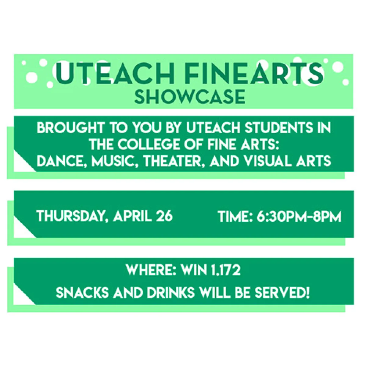 The College of Fine Arts presents the UTeach Fine Arts Showcase, featuring visual art displays/exhibits and performances from UTeach students in music, theatre, and dance.