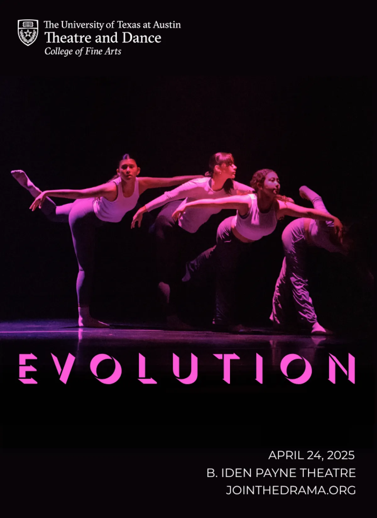 Evolution is a collaborative design laboratory facilitating interdisciplinary experimentation in dance performance. Choreographers from the Department of Theatre and Dance join with concert and event lighting designers and composers from the School of Design and Creative Technologies to create short dance works for the concert stage. This public showcase is presented in the B. Iden Payne Theatre each spring.