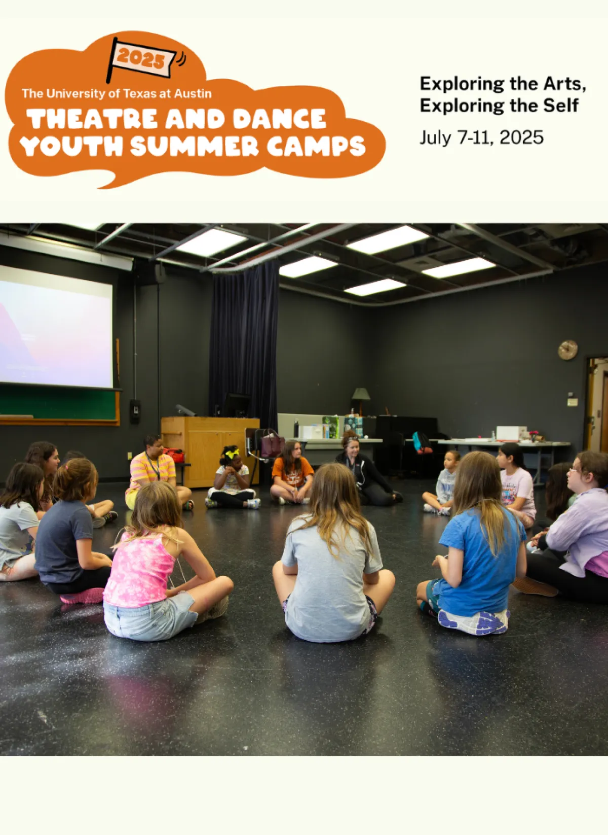 Exploring the Arts, Exploring the Self is a week-long day camp at the Department of Theatre and Dance at The University of Texas at Austin where youth going into grades 2-5 (approximately seven to 11-year-olds) will explore the self through art, music, dance and theatre. Each day, the group will engage the arts to present and perform ideas of who they are, as individuals and as a community. All youth will be involved in each of the disciplines and be challenged to further develop their skills in art forms they are more familiar with as well as try art forms that are less familiar to them.