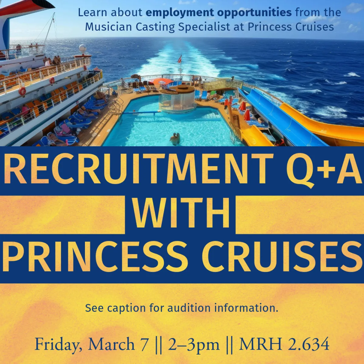 Are you an instrumentalist and/or vocalist who wants to play music in new and exotic places? Come learn about employment opportunities with Princess Cruises from their Musician Casting Specialist, Graham Shackelford. For those interested, Graham will also hold auditions in the Butler School of Music the following day, March 8th, from 12-4pm.