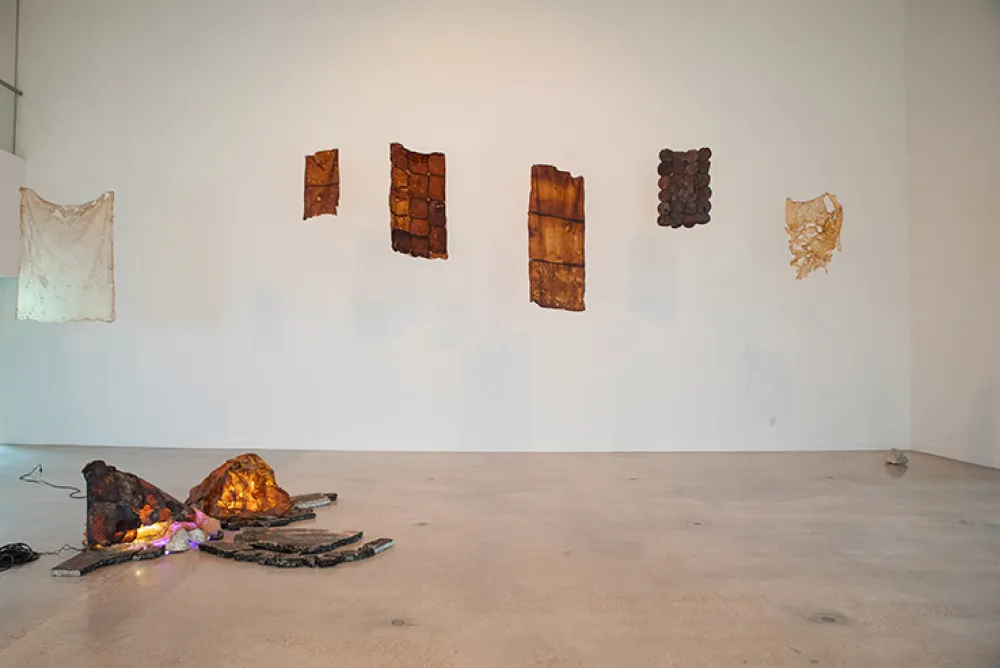 Las Nietas de Nonó used the dried SCOBYs in a multitude of ways, creating quilt-like shapes, covering objects in a hodge-podge fashion or even projecting multicolored lights onto a large piece with rough edges. Referencing images of their childhood, including their neighborhood basketball courts, the installation created in the Vaulted Gallery encompassed many aspects of community, including the microcosm of the SCOBY itself.