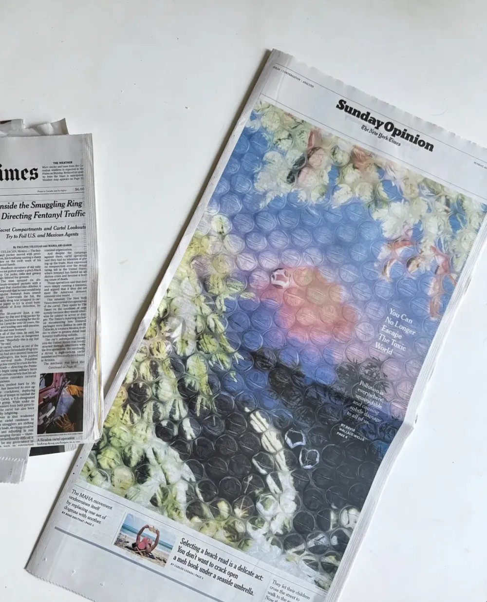 Rosie Clements' (MFA Studio Art, 2024) UV-printed photograph on bubble wrap on the cover of The New York Times Sunday Opinion in print