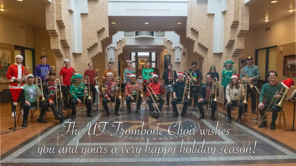 The University of Texas Trombone Choir wrapped up the semester with an impromptu concert at the alumni center. They spread Christmas cheer with a number of classics, including Feliz Navidad, Winter Wonderland and We Three Kings. "I feel like this is a perfect way to wrap things up," said D.M.A Trombone student Jared Dickerson, who played trombone and conducted a number of tunes during the concert. "We had a lot of serious concerts during the year, which is great to be back in the concert hall, but this is also part of the live music, just super casual playing for people."